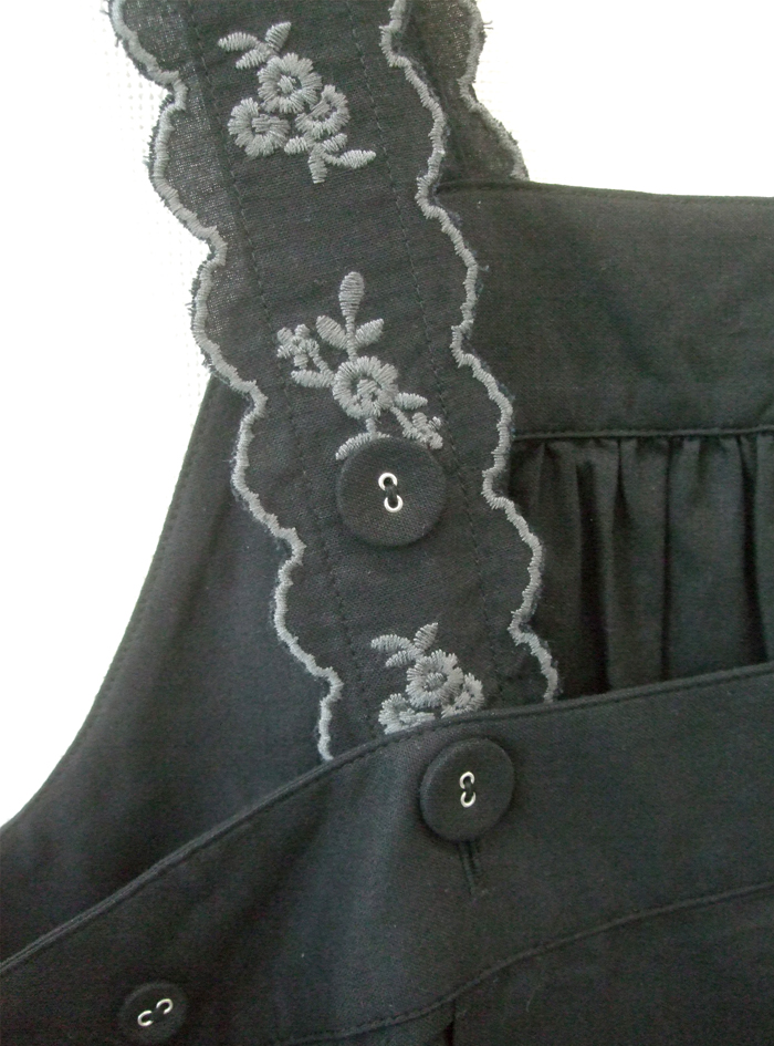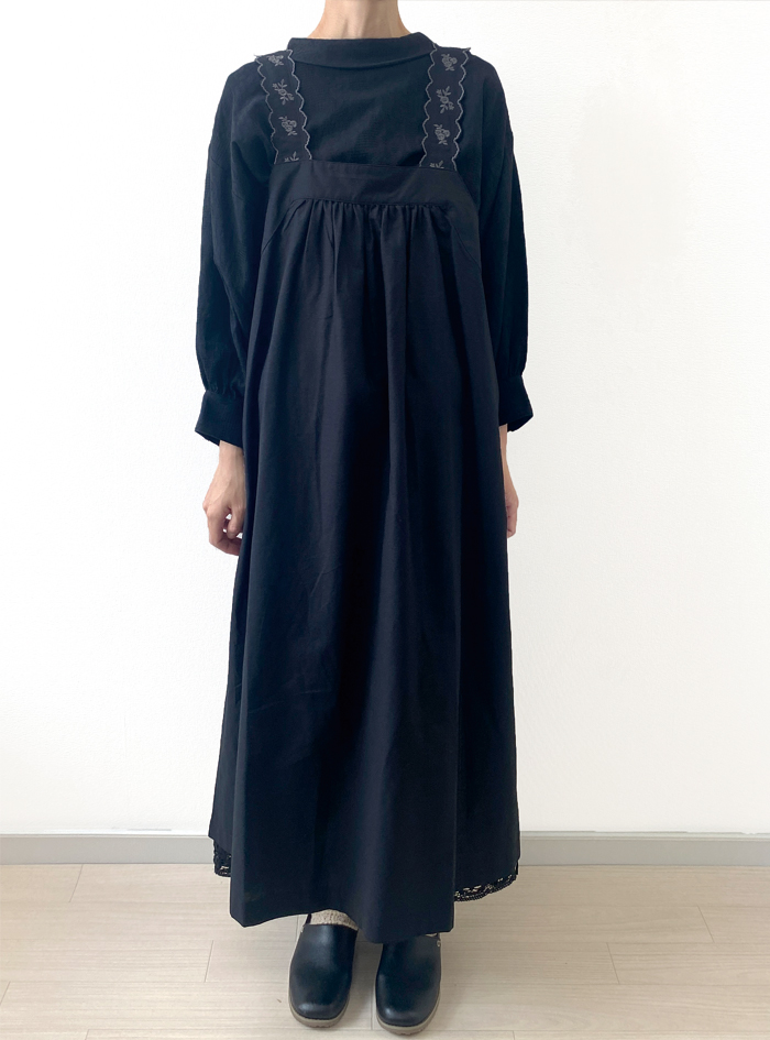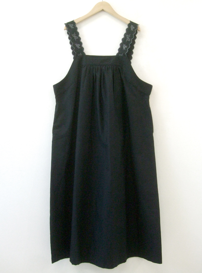 肩のストラップ部分にスカラ刺繍をあしらい、ガーリーで優しい印象のデザインに仕上げました。