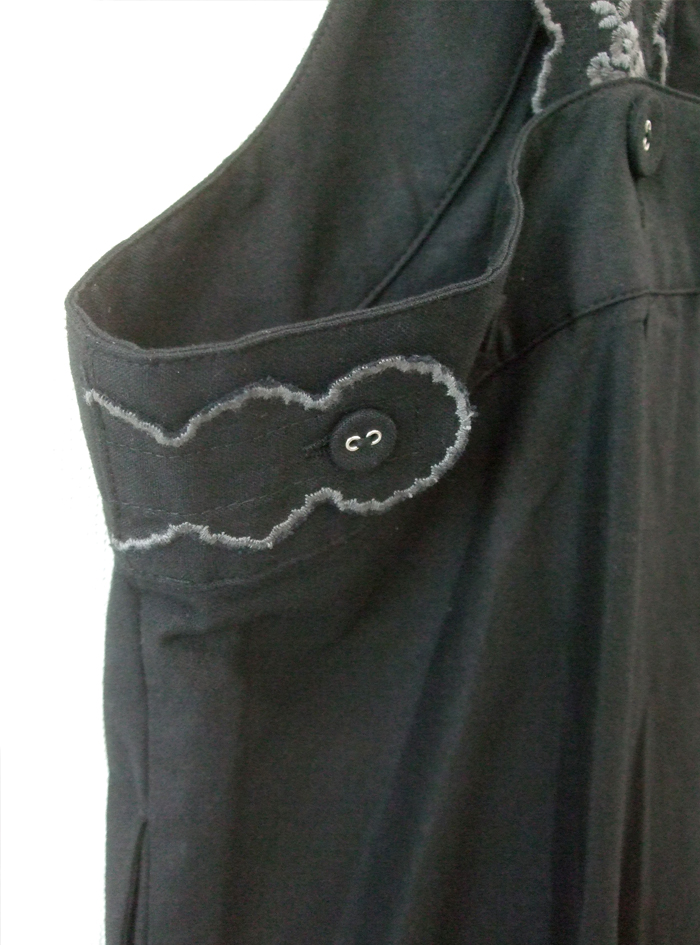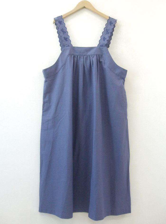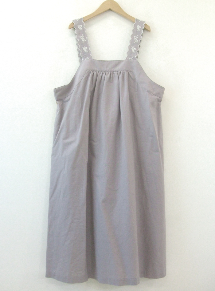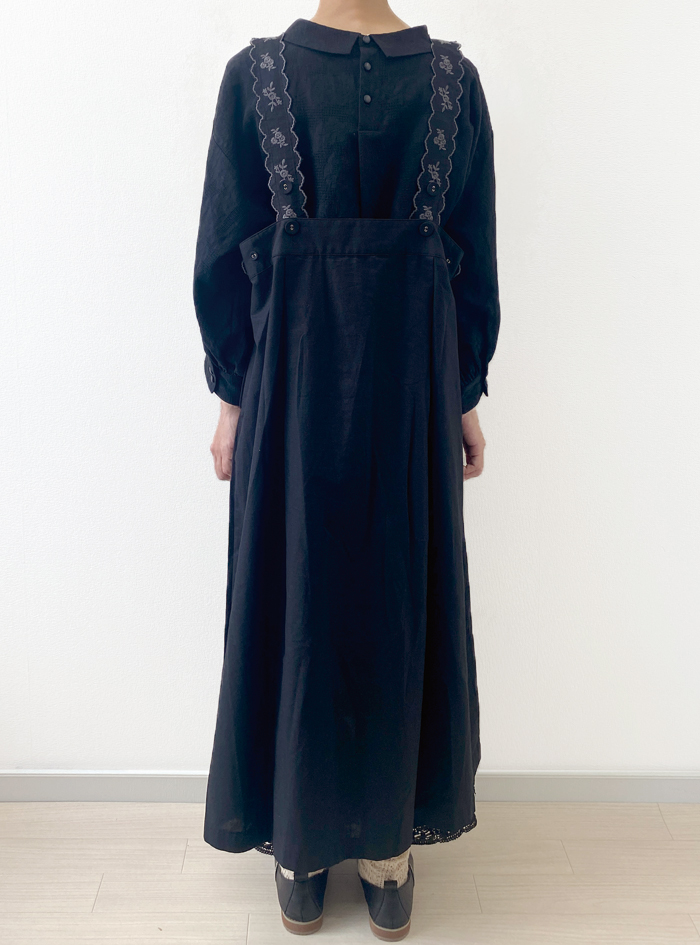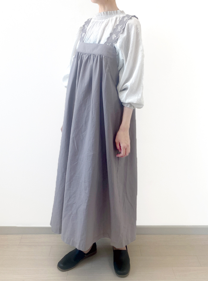 コットンリネンのナチュラルな平織生地に、モチーフ刺繍をあしらったジャンパースカート。