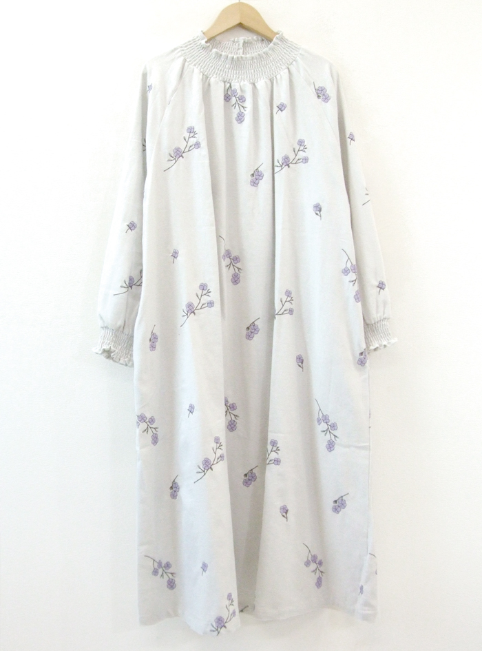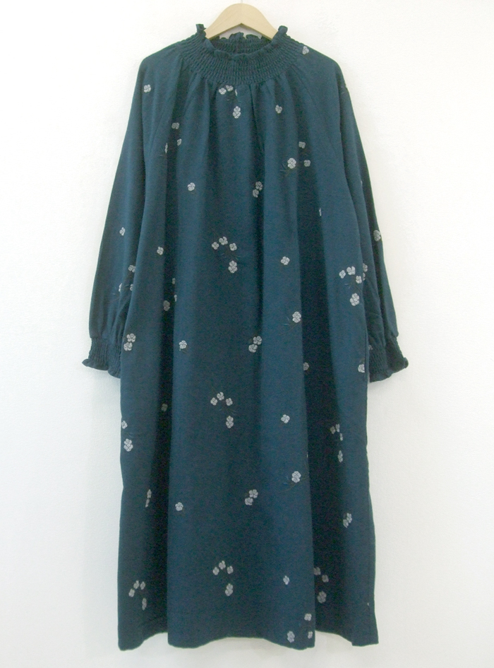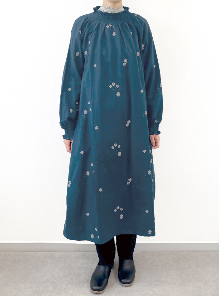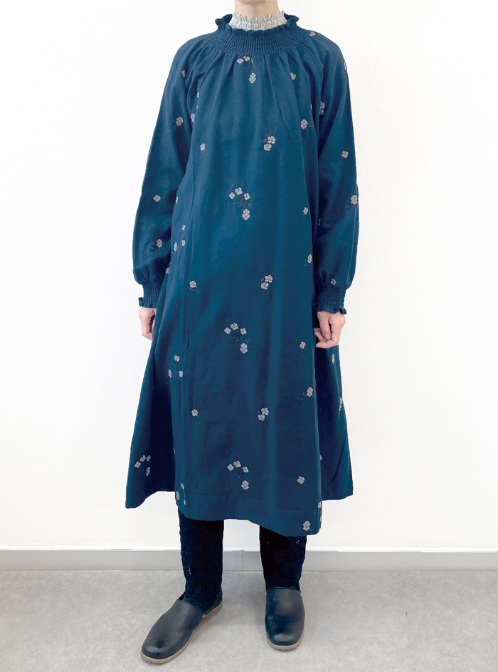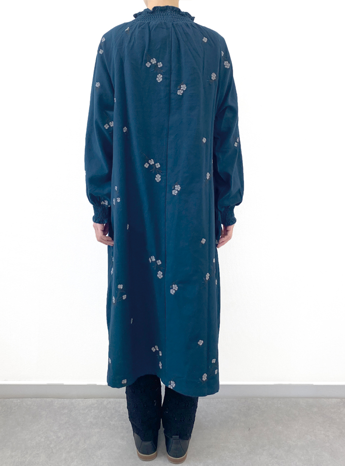 柔らかく暖かみのある綿起毛素材に、コロンとしたコットンボールモチーフ刺繍が可愛いワンピース。