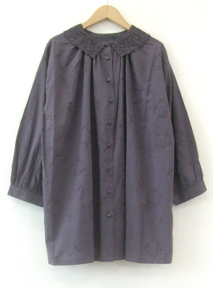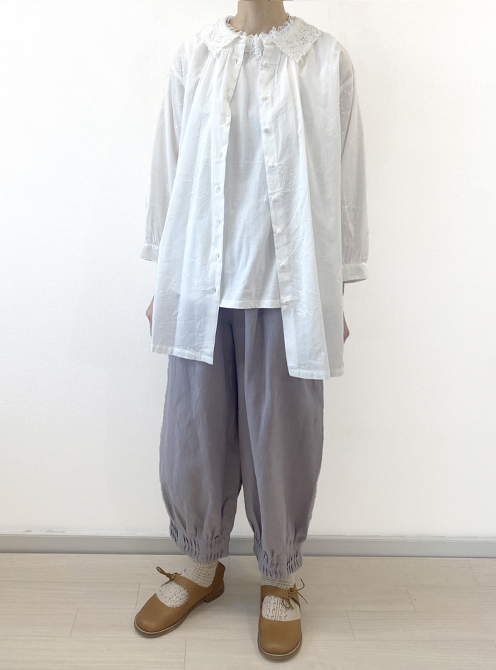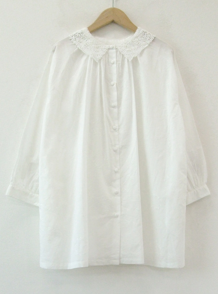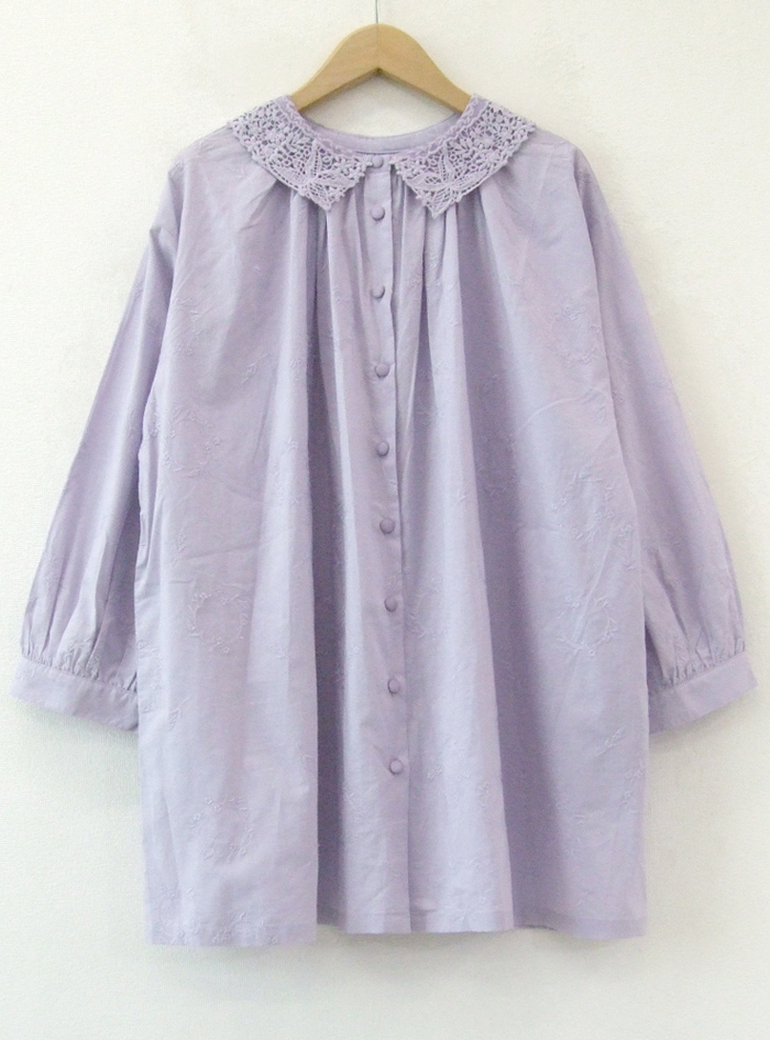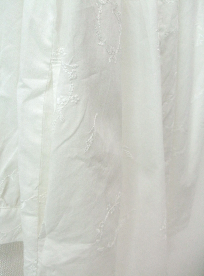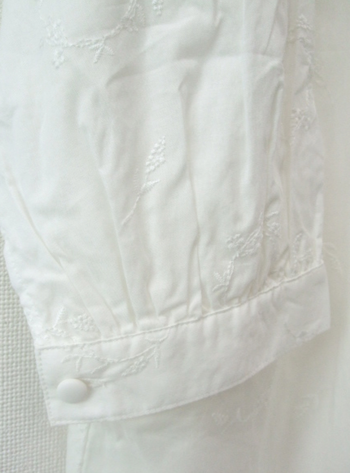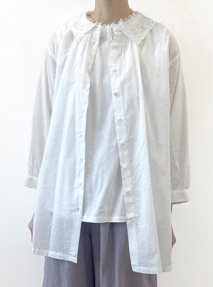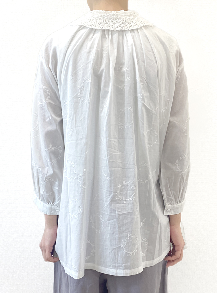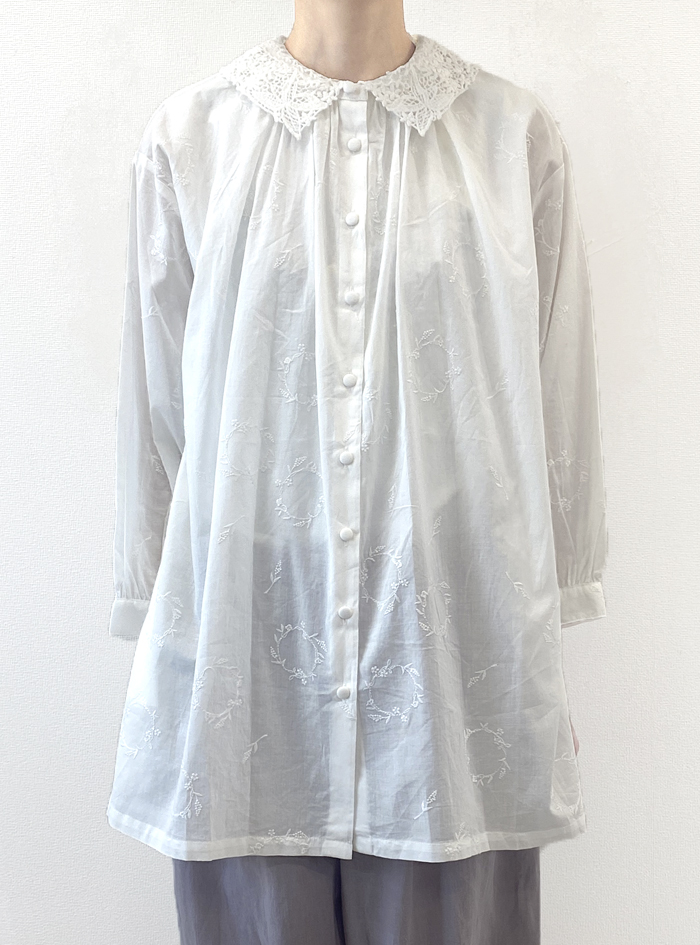 薄手のコットンローン生地に、フラワーリースモチーフの可憐な刺繍をあしらったロングブラウス。