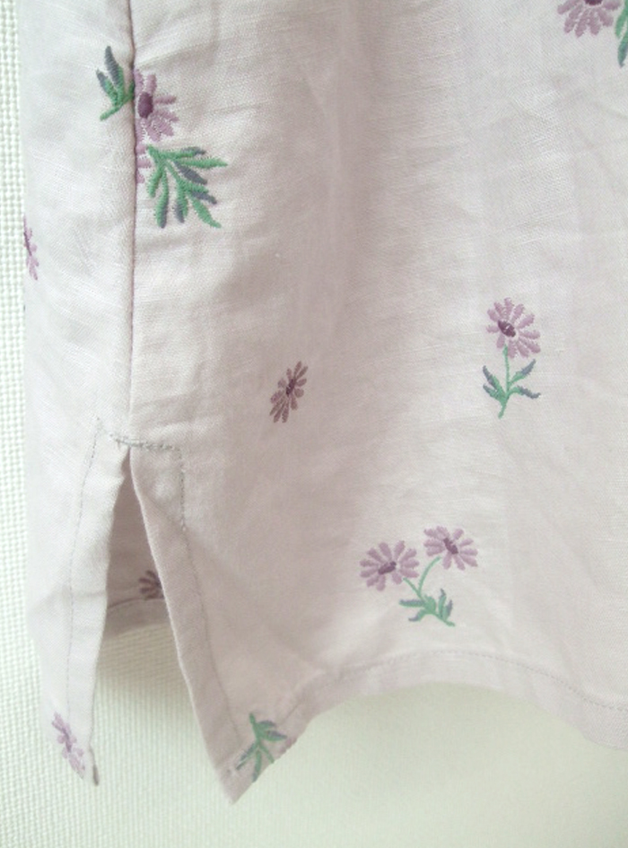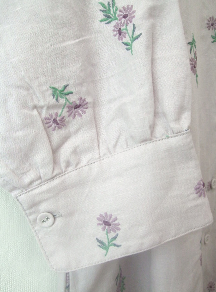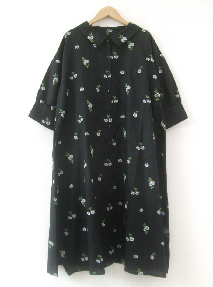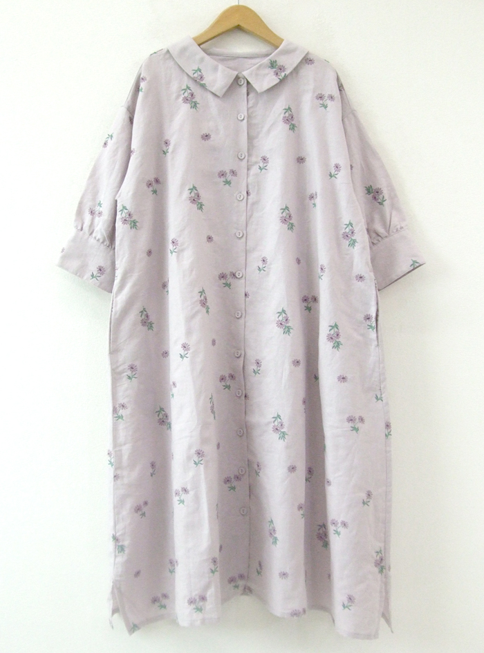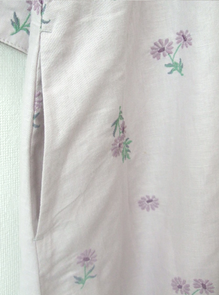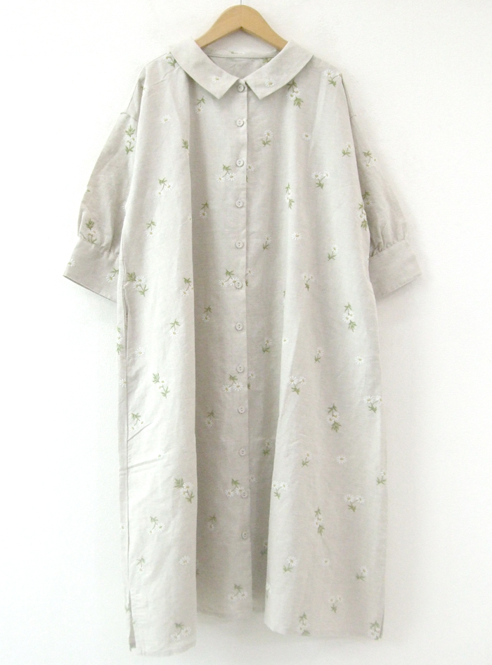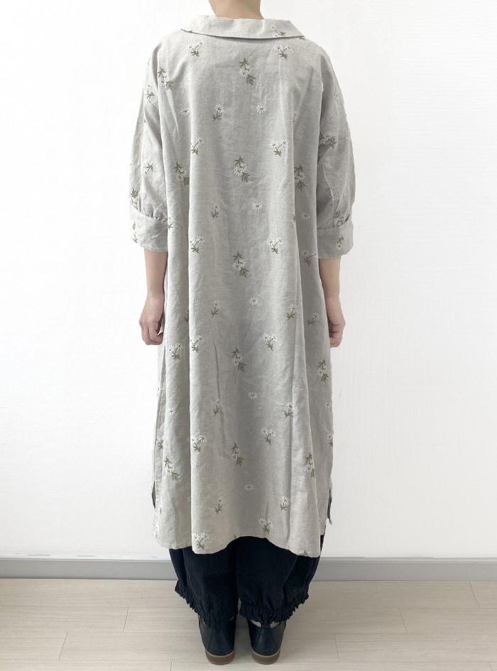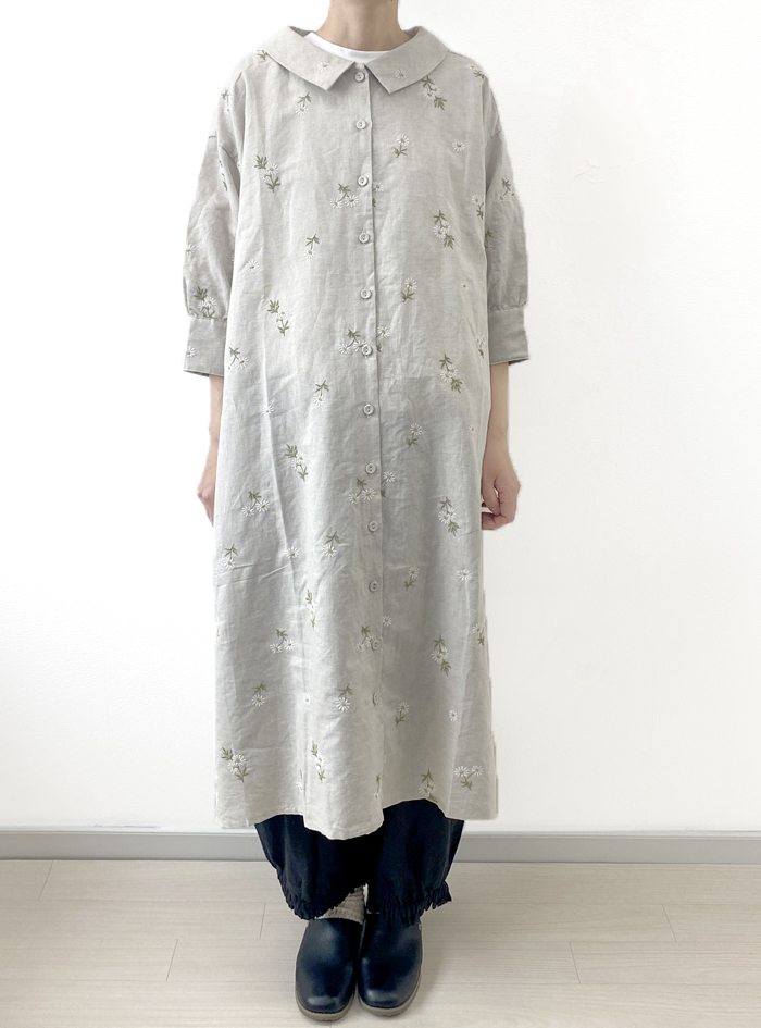 薄手のリネンコットンのナチュラルな平織生地に、マーガレット柄の生地刺繍を加えたワンピース。