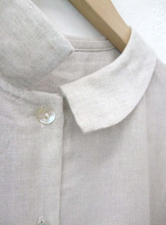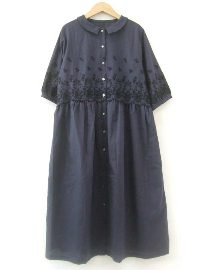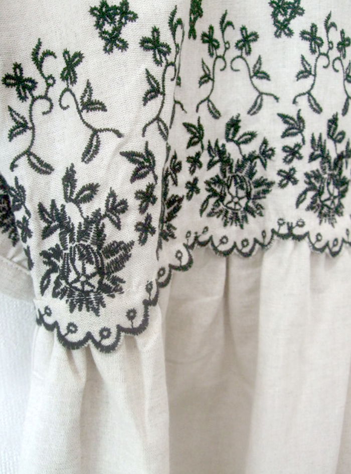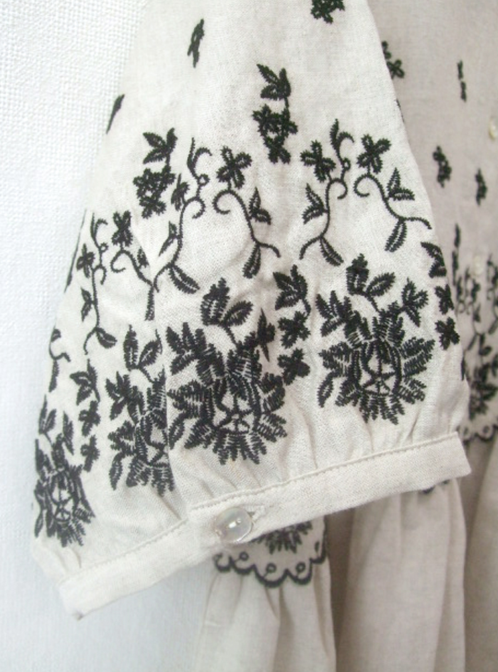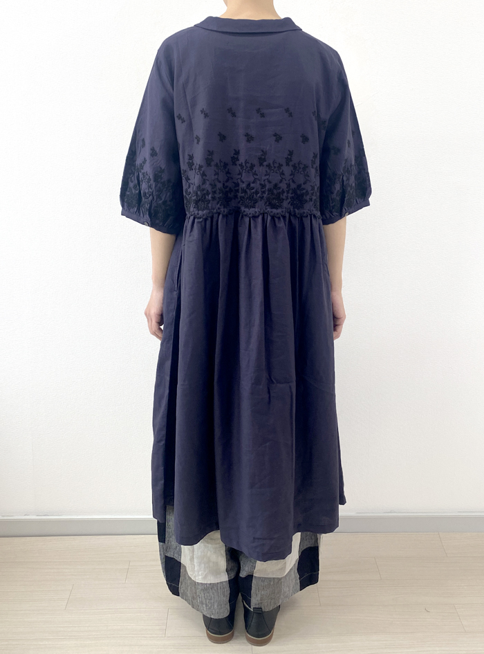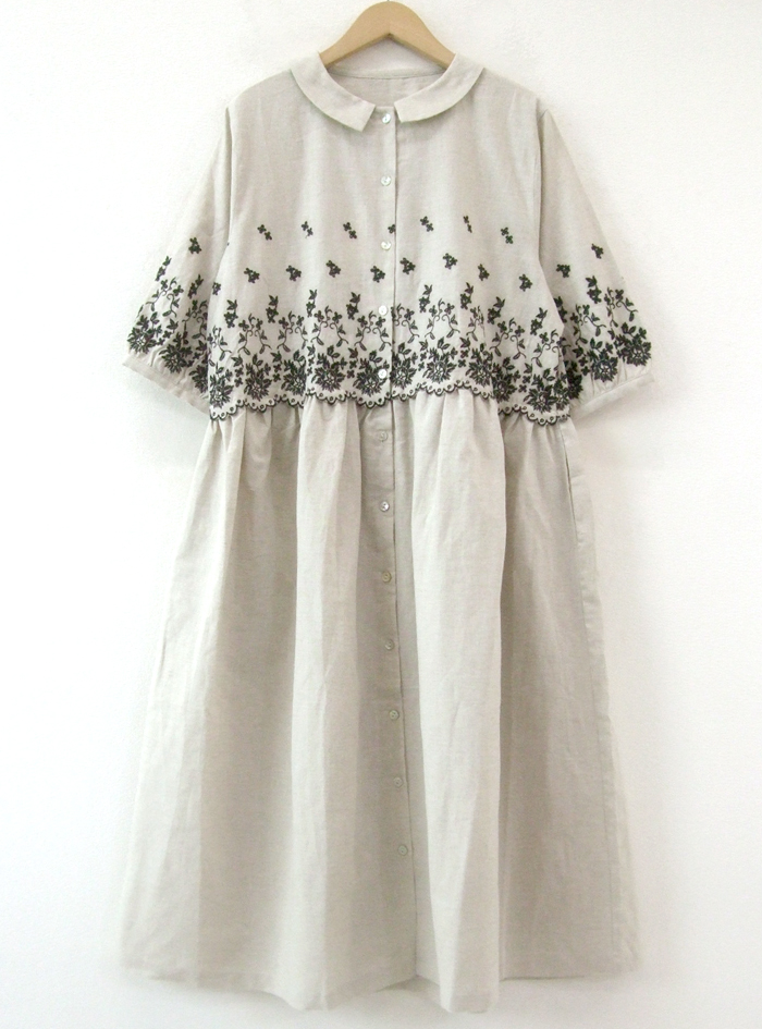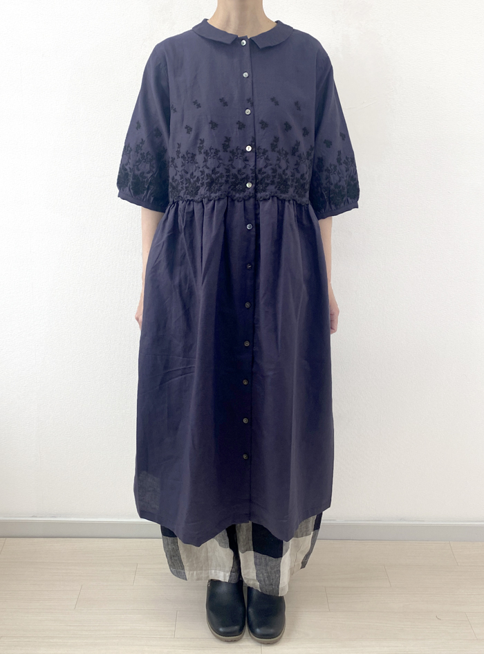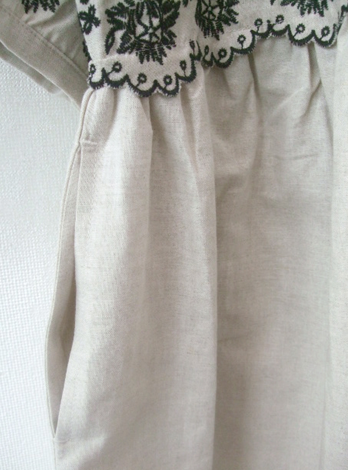 薄手のリネンコットンのナチュラルな平織生地に、スカラ刺繍を加えたワンピース。