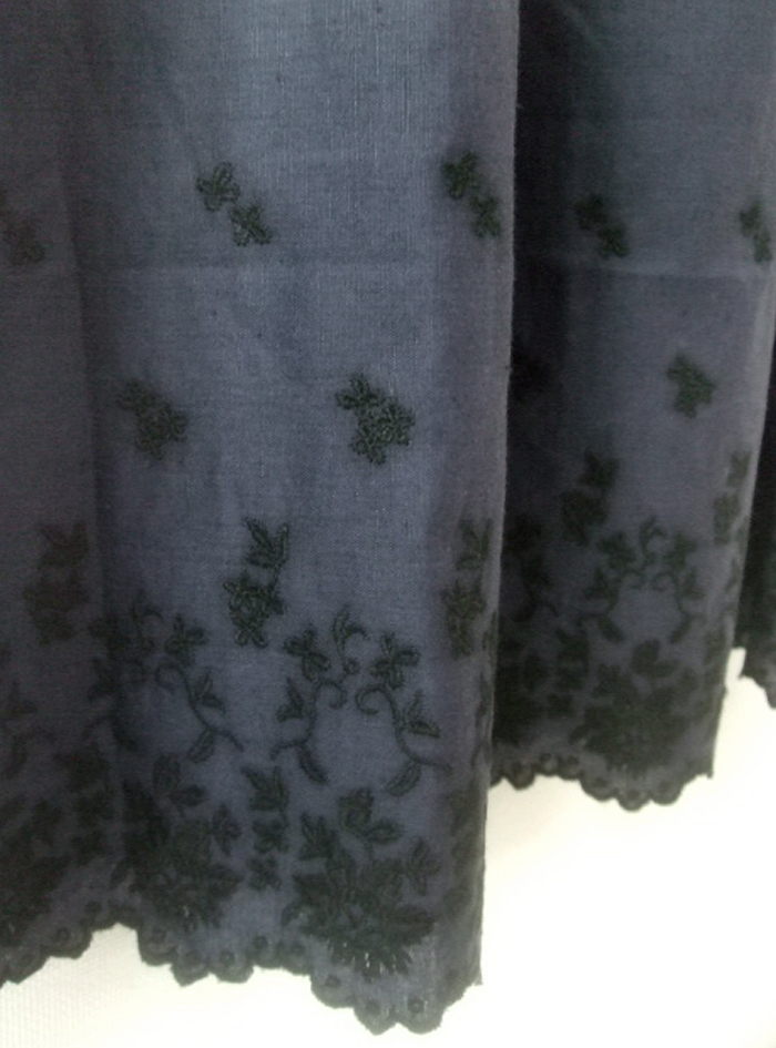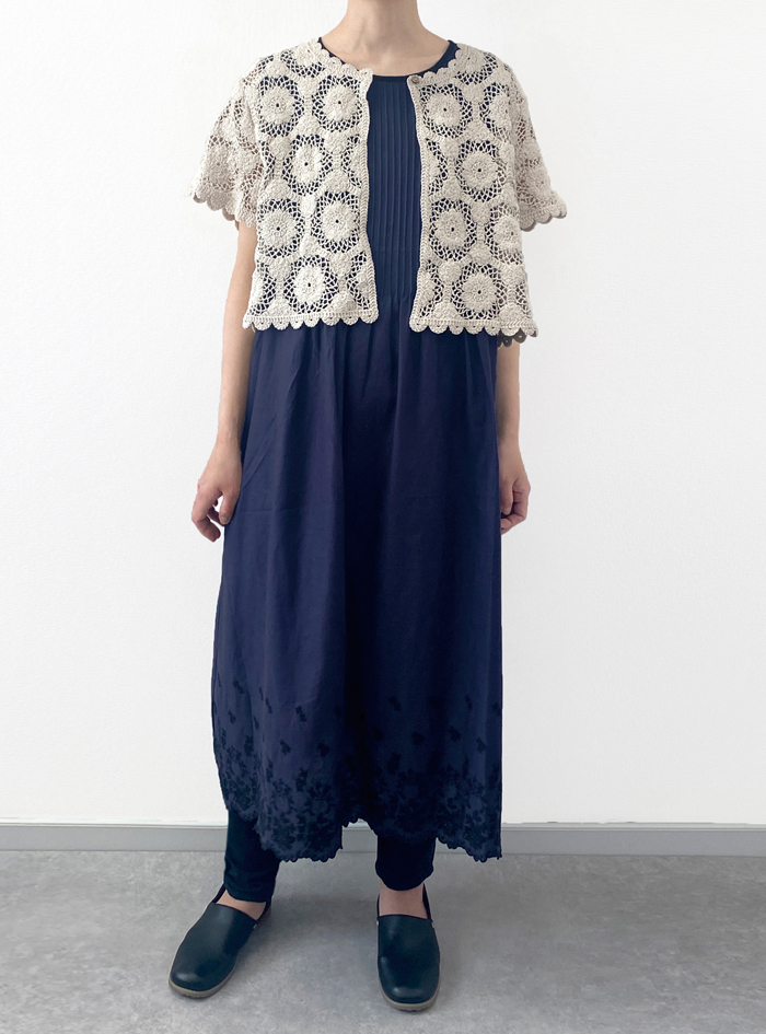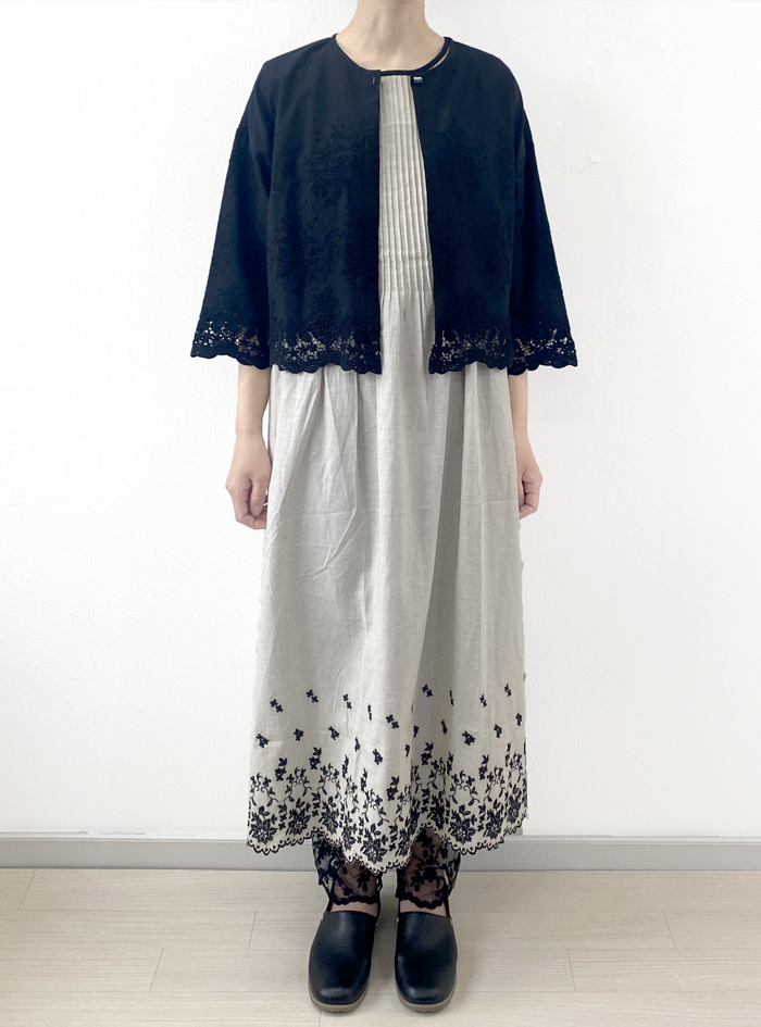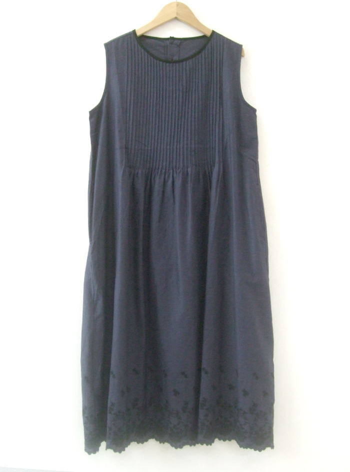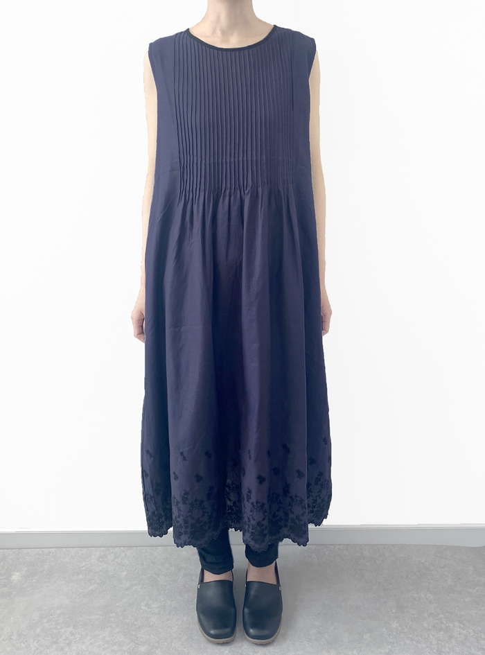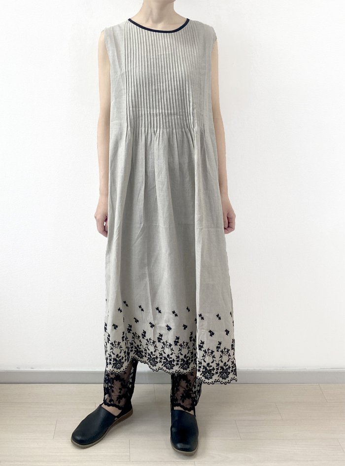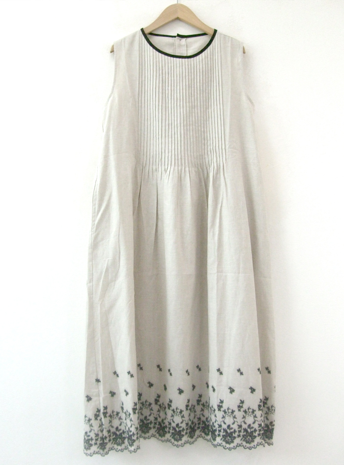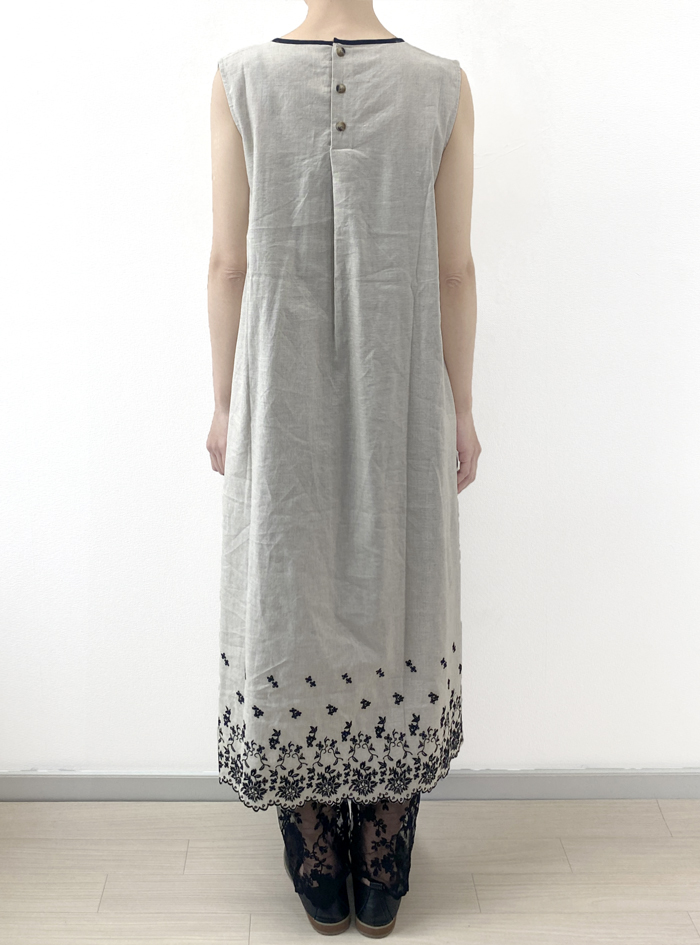薄手のリネンコットンのナチュラルな平織生地に、スカラ刺繍を加えたノースリーブワンピース。