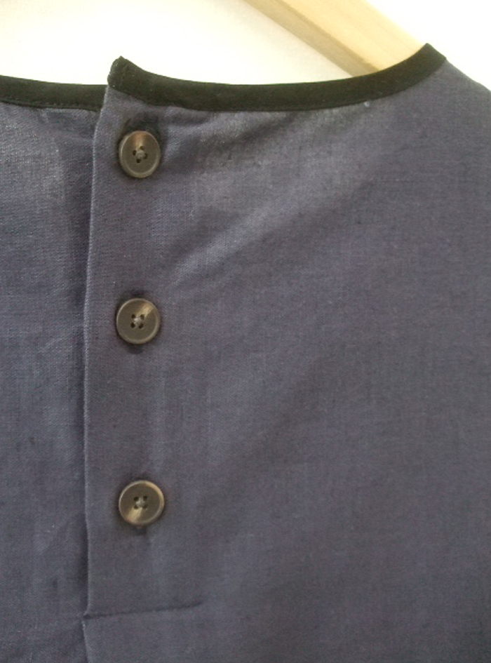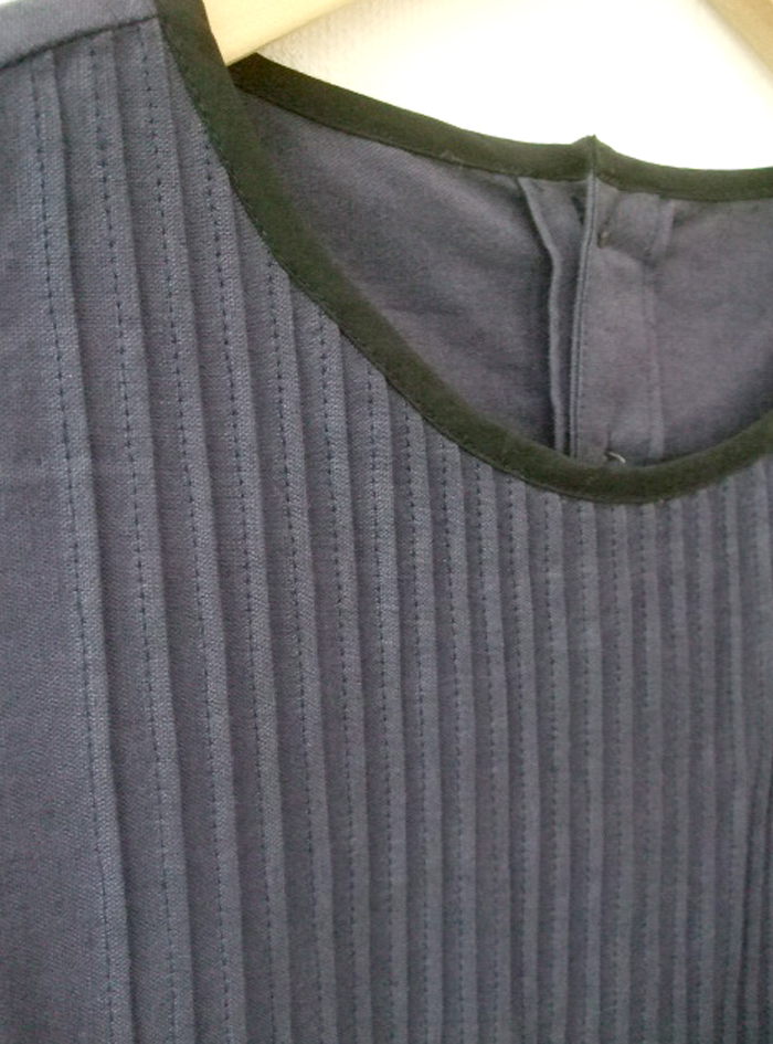 胸元ピンタックに、衿ぐりの配色パイピングがアクセントになったデザイン。