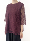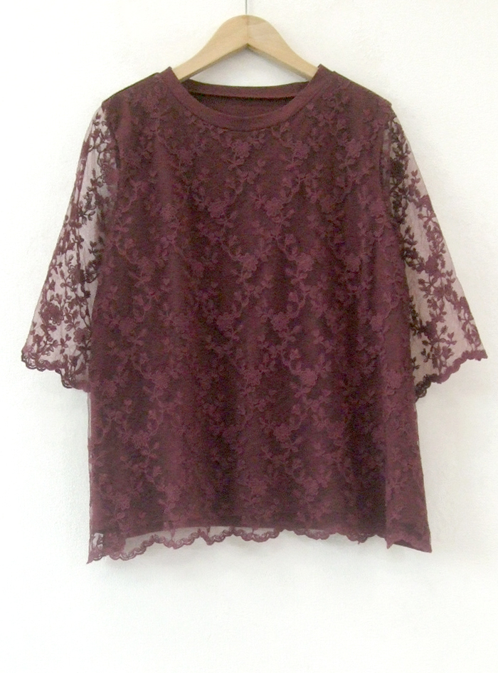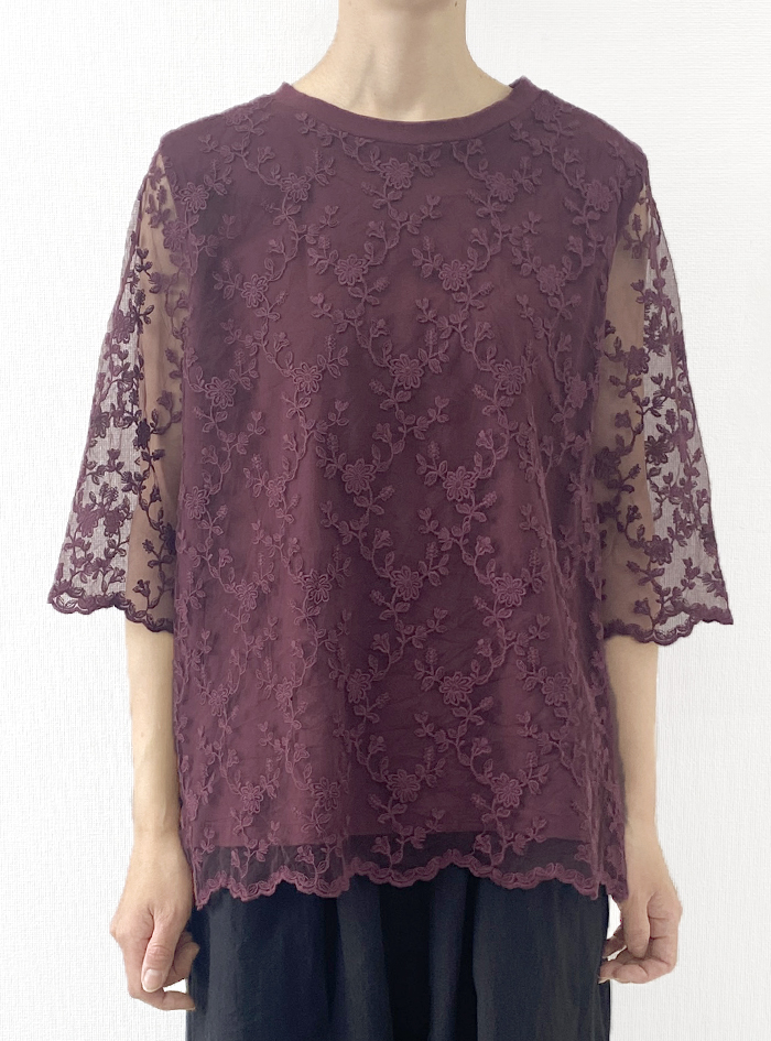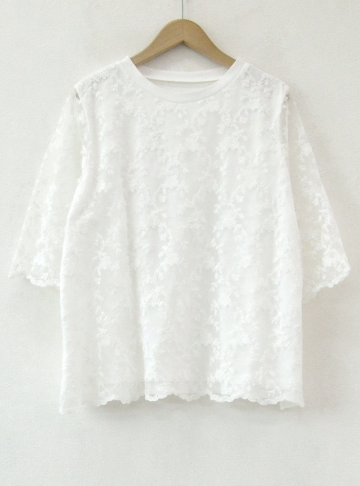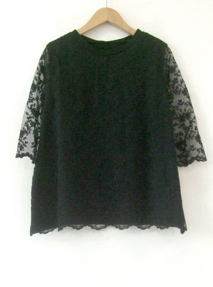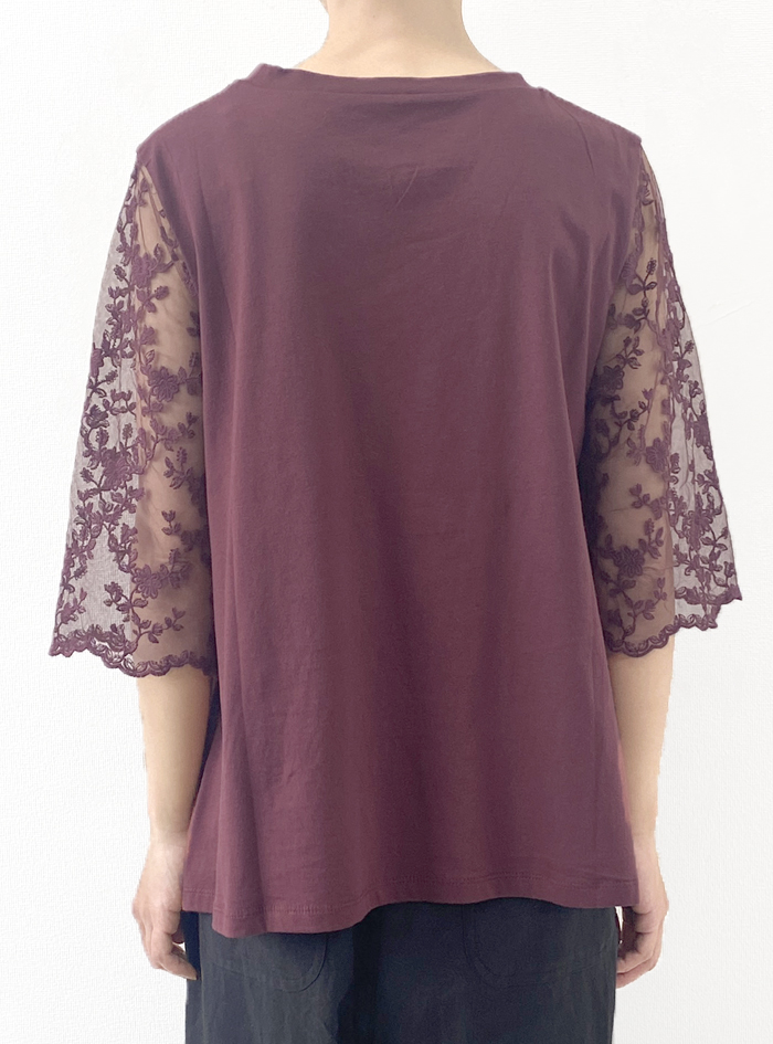前見頃はレースとコットンカットソーの二枚仕立て、後ろはコットンカットソー、袖はレースで透け感のあるデザインに仕上げています。