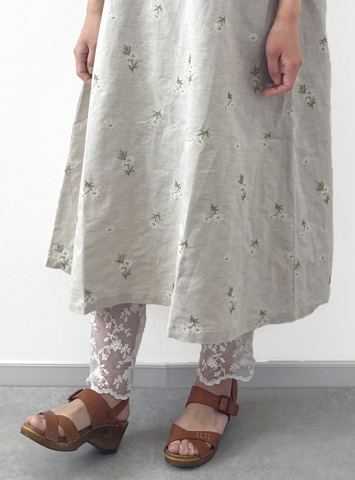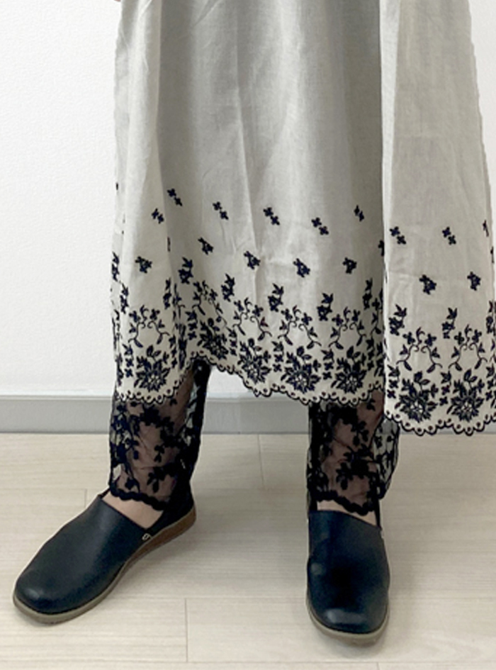 ひざ下から透け感のあるチュールレース切替になっていて、ワンピースやスカートなどに重ねて、涼やかでフェミニンな足元を演出してくれます。