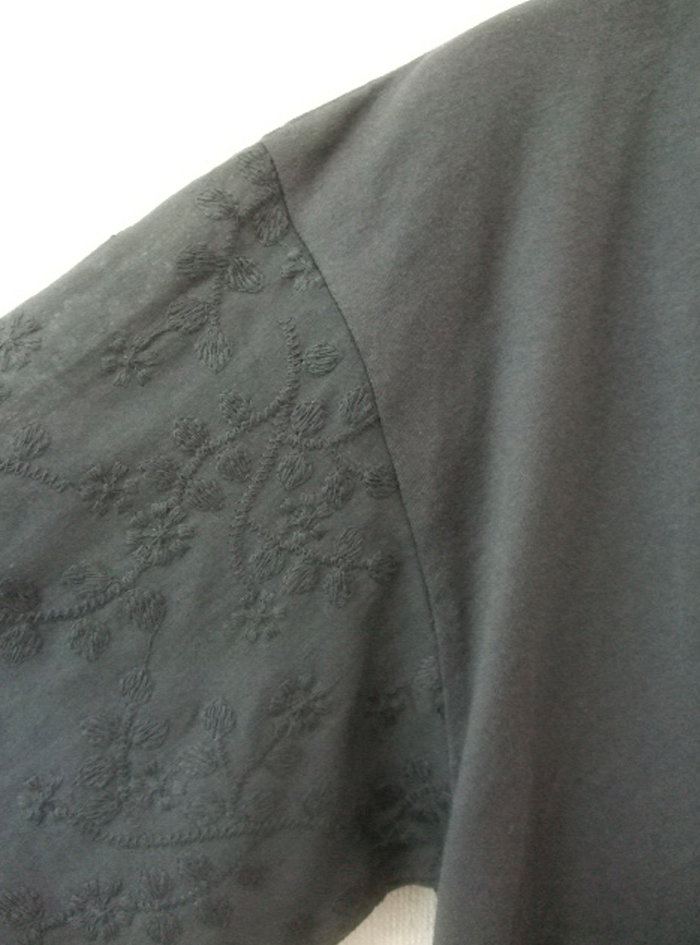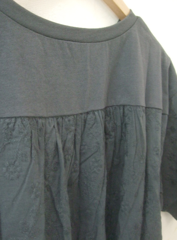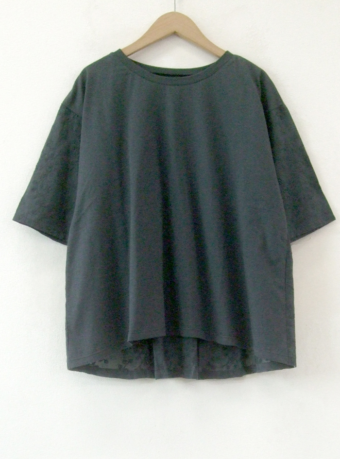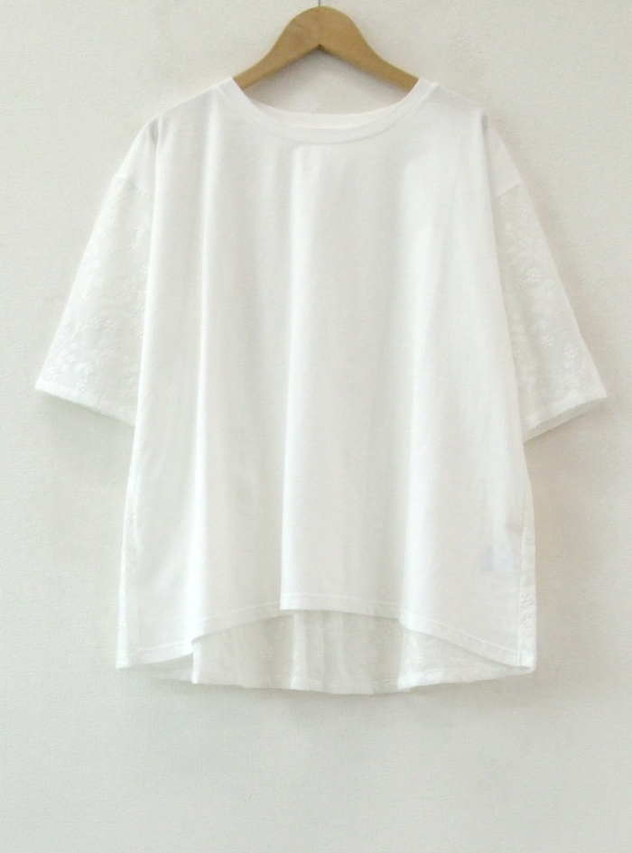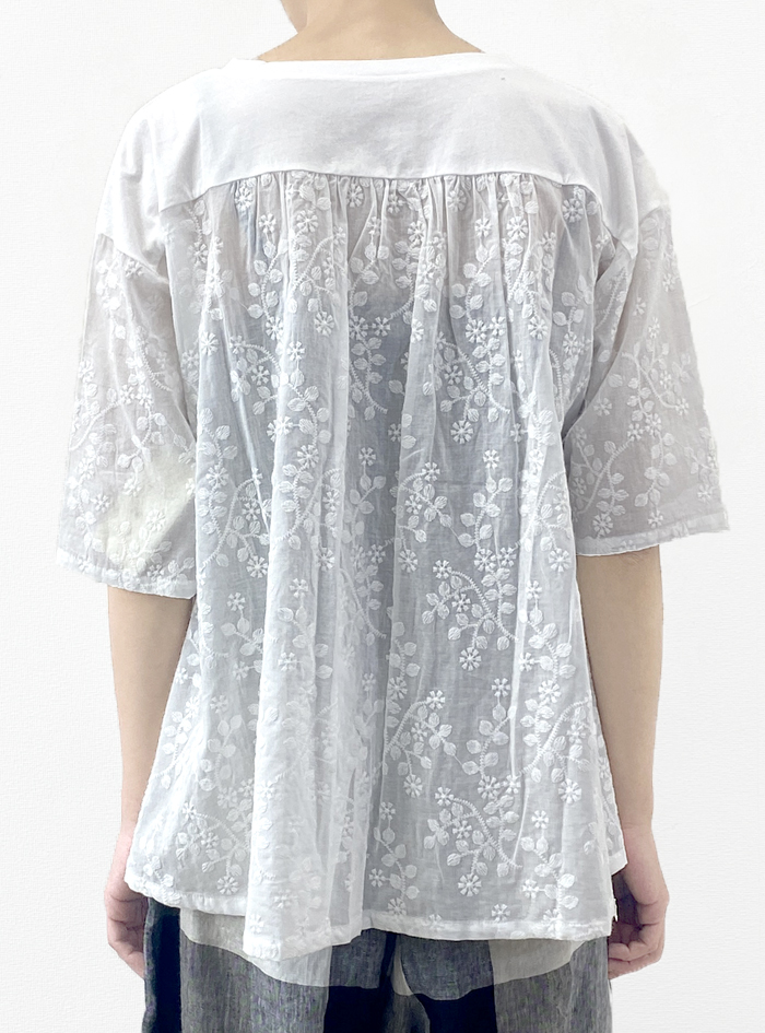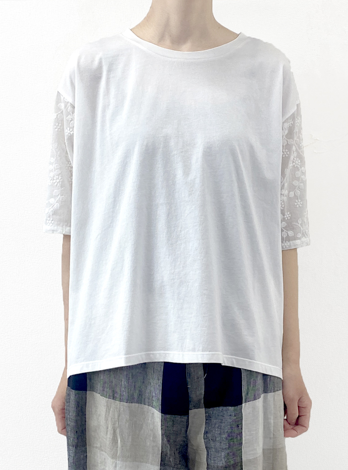 前身頃と後ろヨーク切替上はコットンカットソー、後ろギャザー身頃と袖は刺繍生地で、前はシンプル、後ろはフェミニンなデザインに仕上げています。