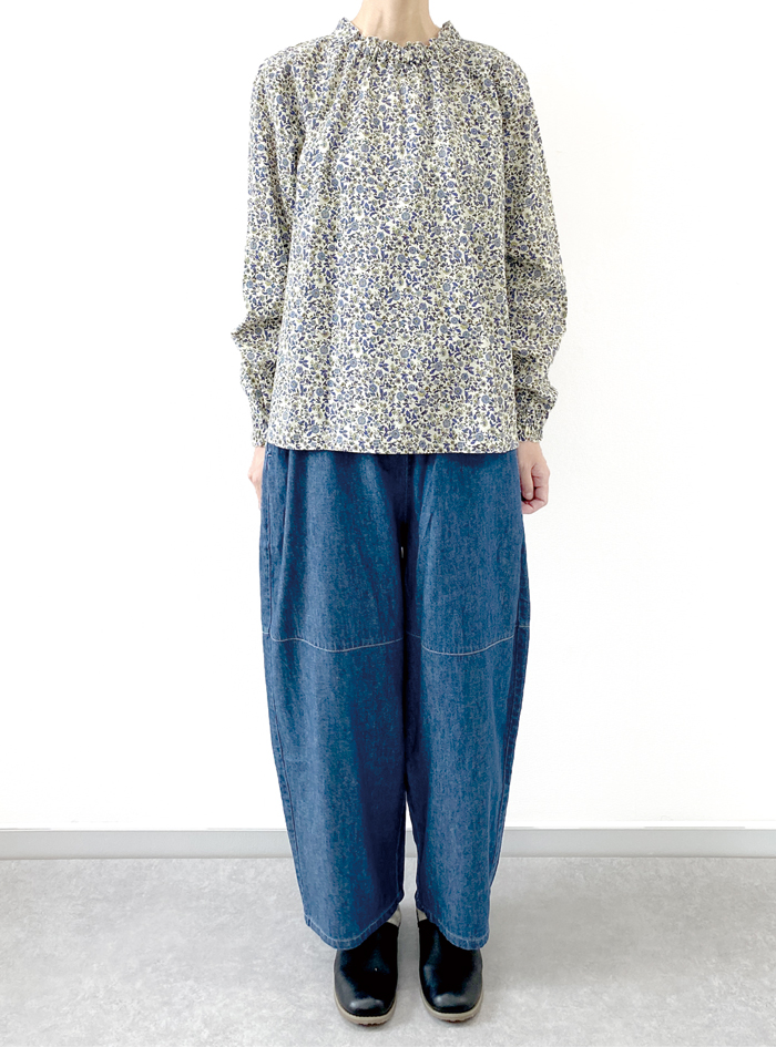 ハイネックのフリル衿と、袖口はゴム入りギャザーでラクチンで可愛く着用頂けます。