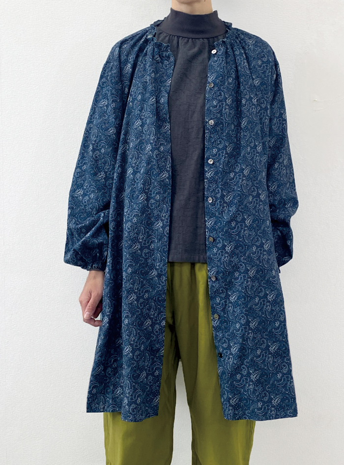 衿ぐりと袖口にゴムシャーリングをあしらって、ふんわり優しい印象に仕上げています。