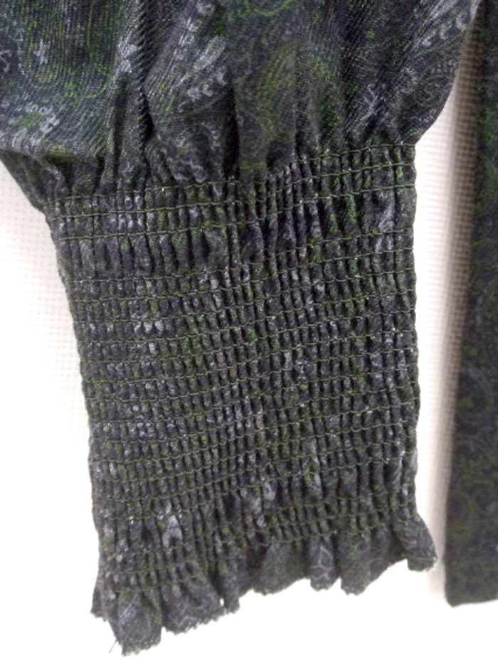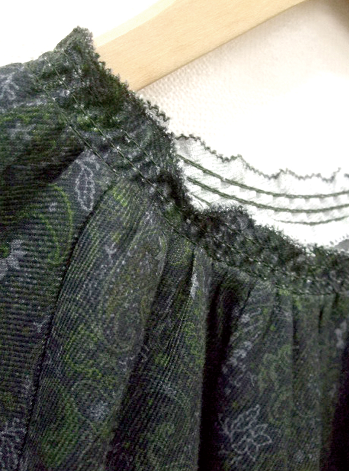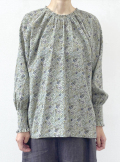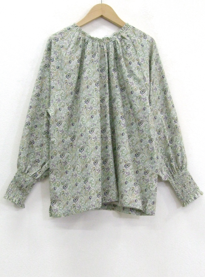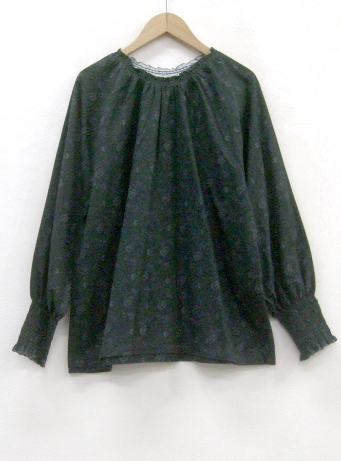 衿ぐりと袖口にゴムシャーリングをあしらって、ふんわり優しい印象に仕上げています。