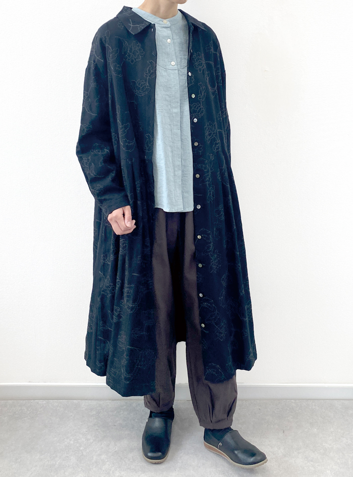 マキシ丈で一枚でも雰囲気よく着こなせます。ボタンを開けてレイヤードアウターとしても使いやすいアイテムです。