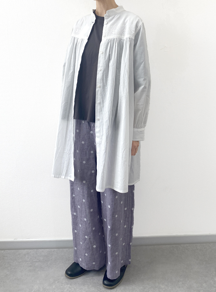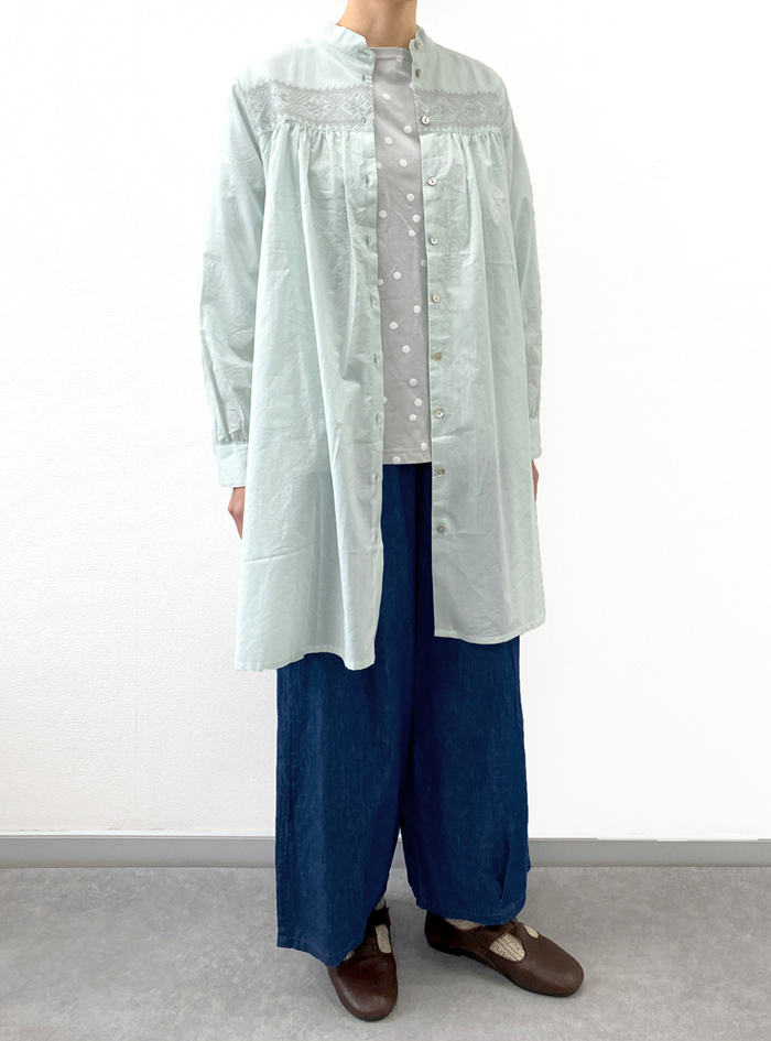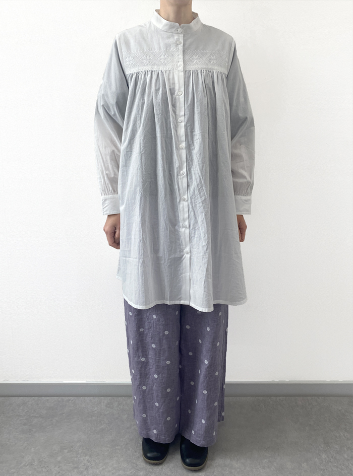前後のヨーク切替部分に刺繍をあしらって雰囲気よく仕上げています。