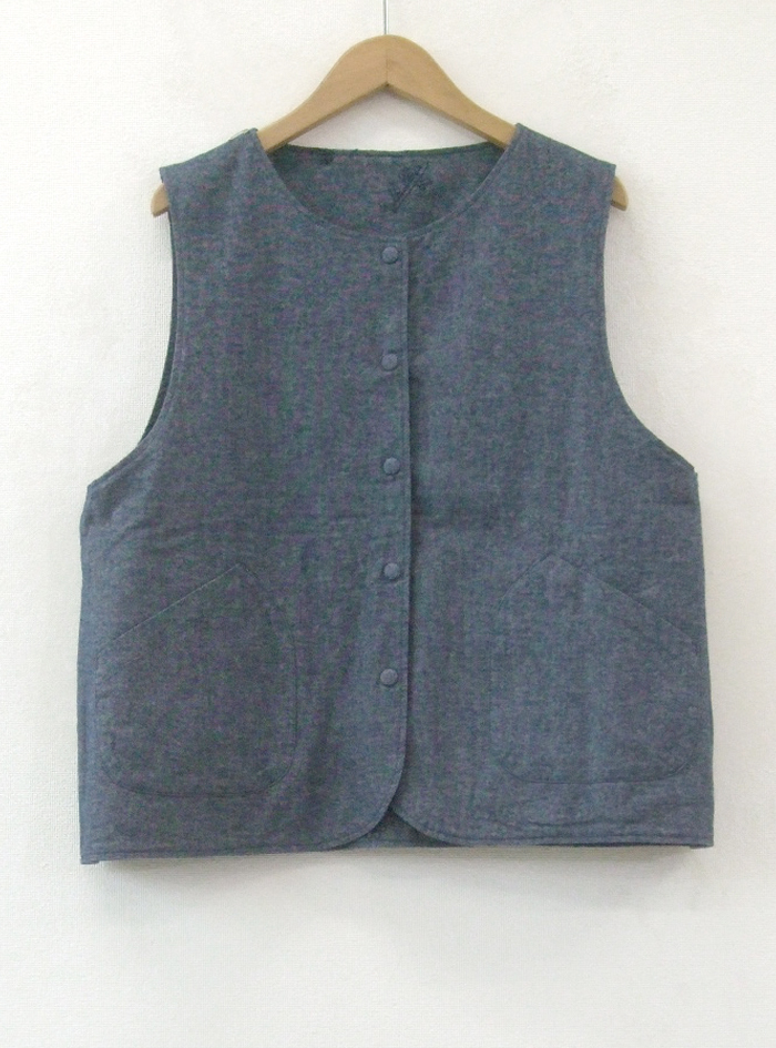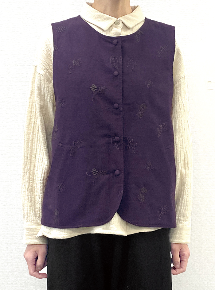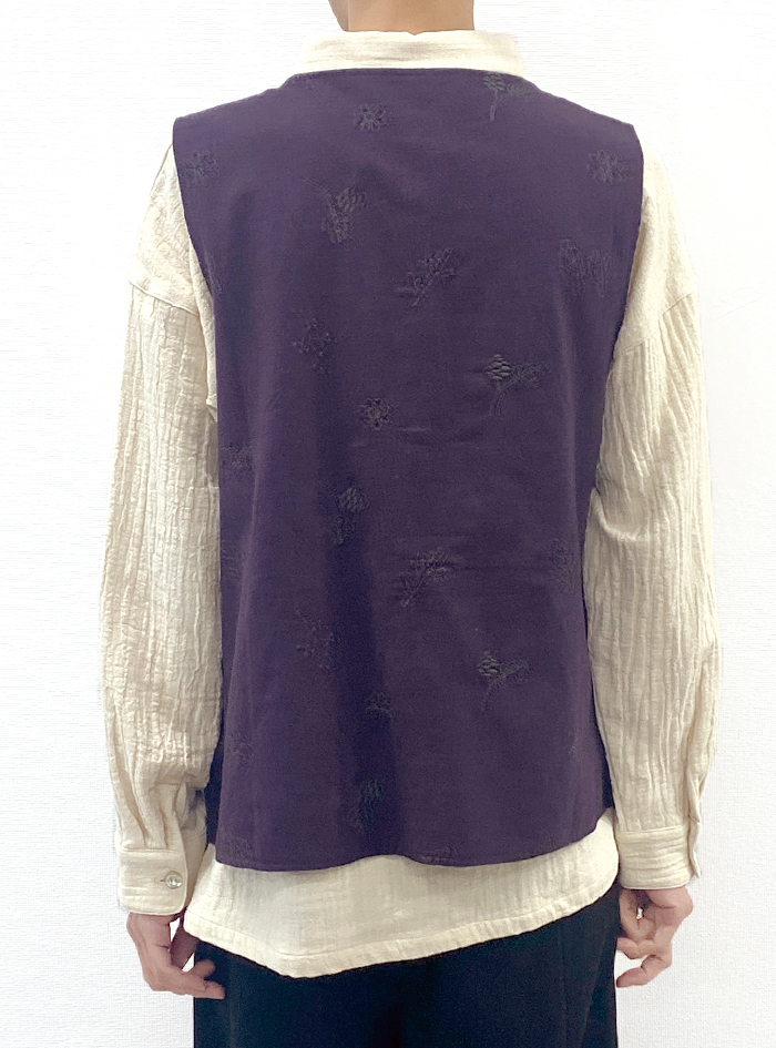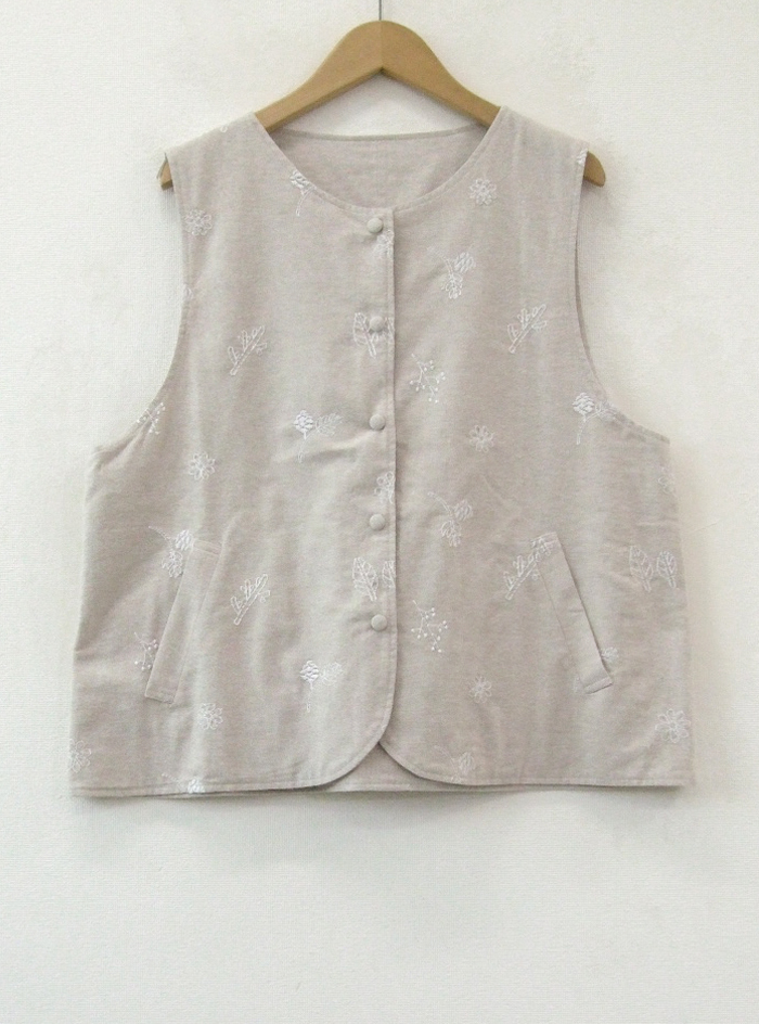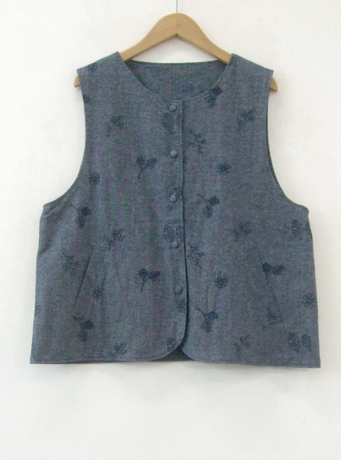 コットンシャンブレー生地に、冬らしい北欧風ボタニカル刺?をプラスしたベスト。