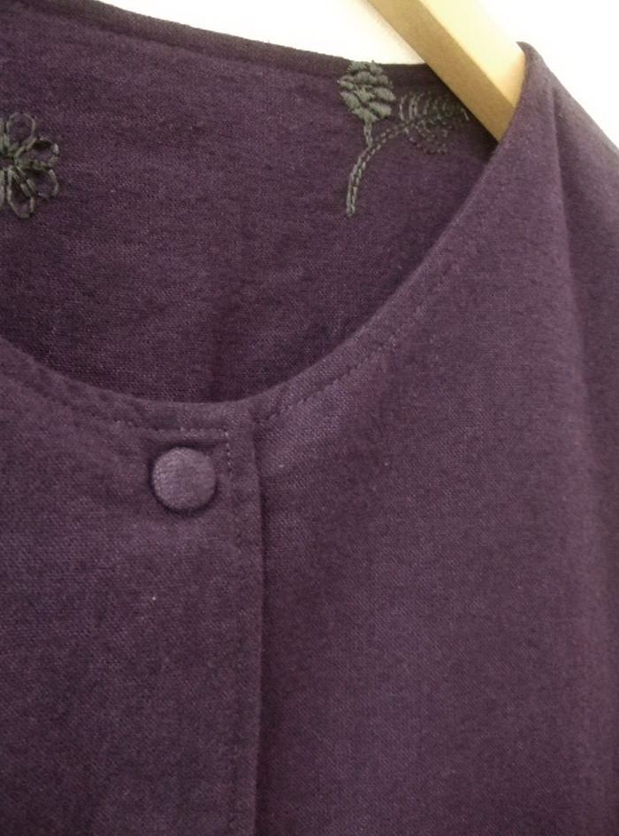 片面は刺繍生地、片面は共生地無地の両面リバーシブルデザイン。