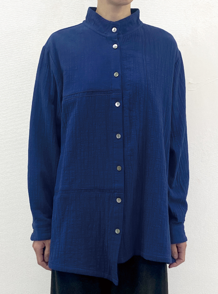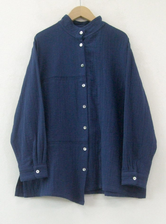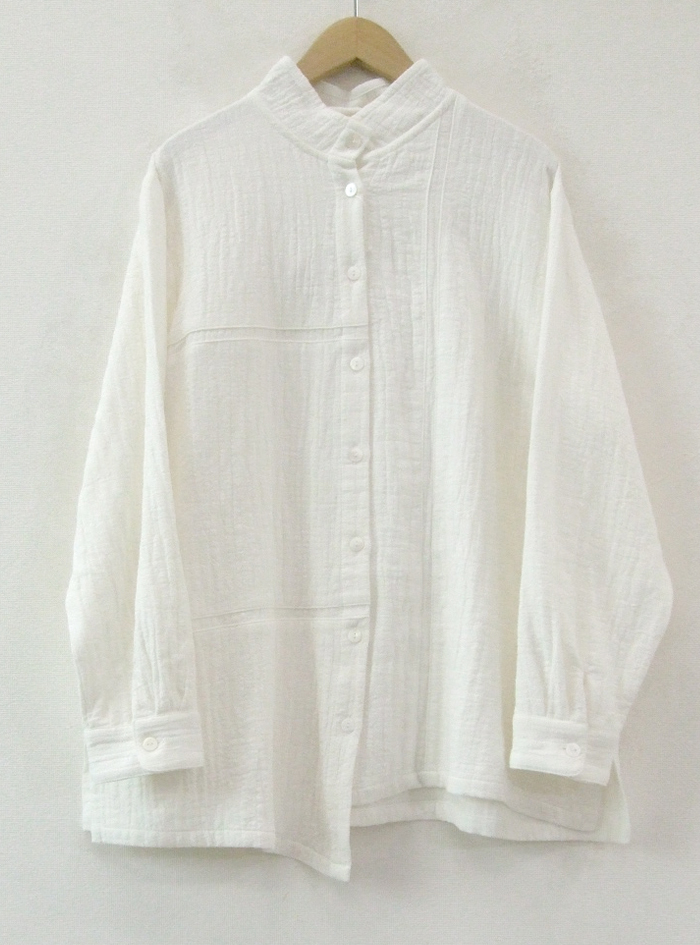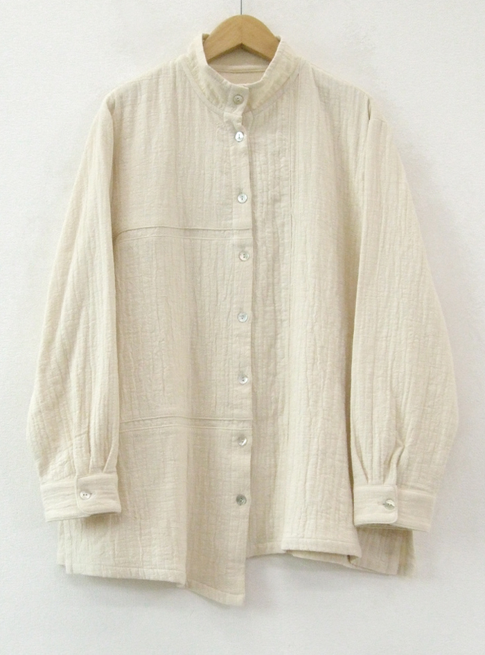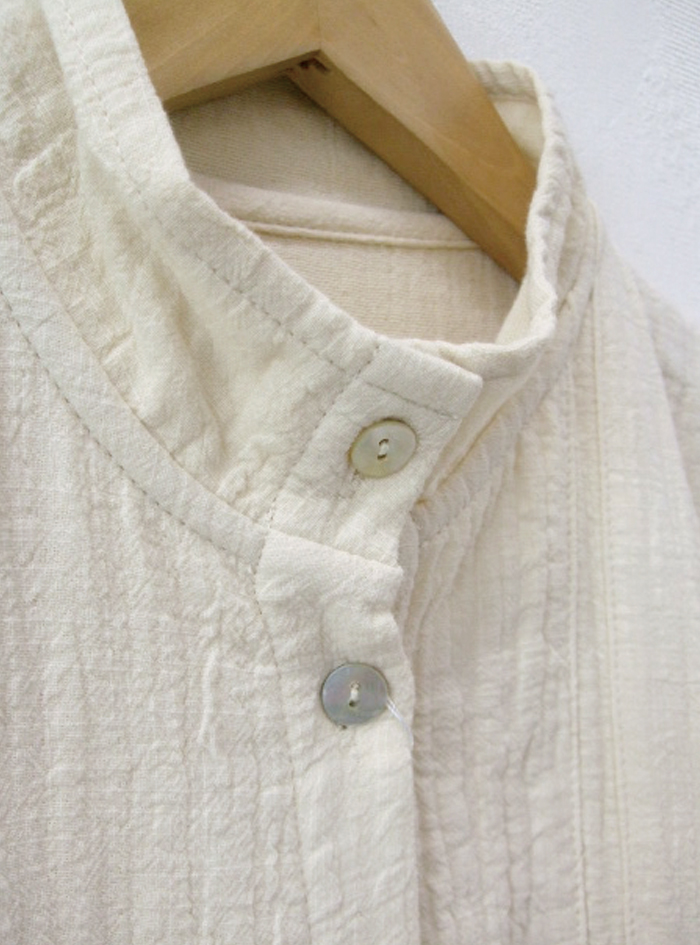 畝のあるナチュラルな表面感のコットン生地とガーゼ生地を接ぎ合せた接結生地のチュニックブラウス。