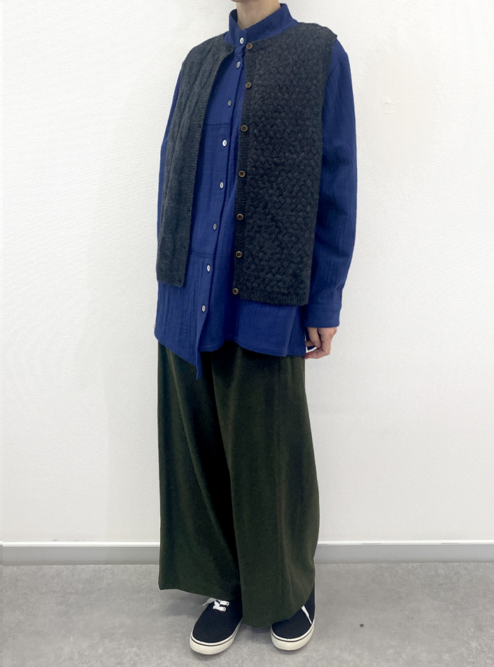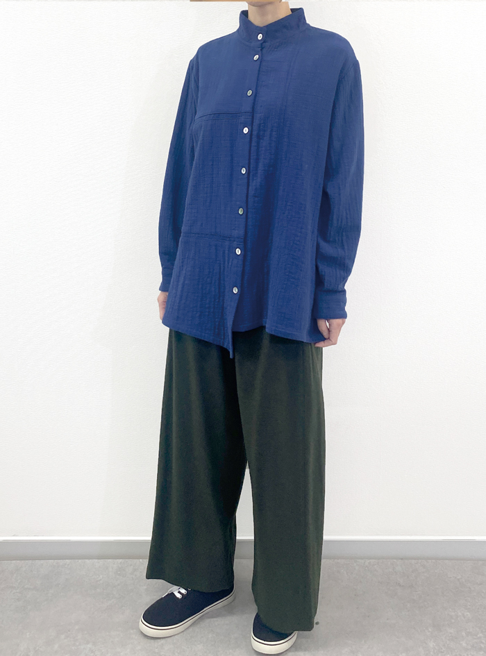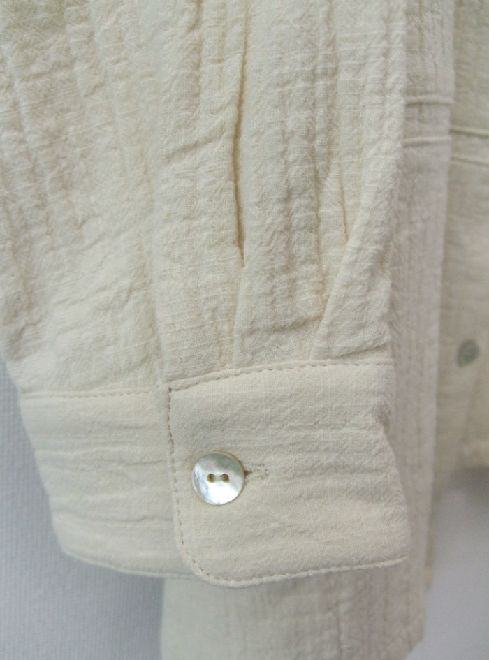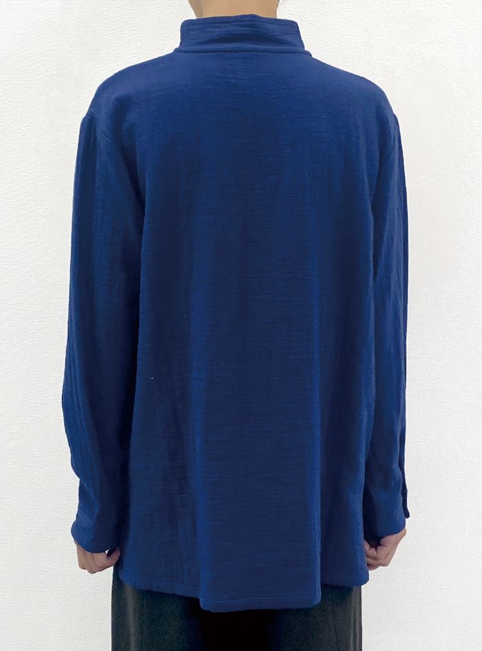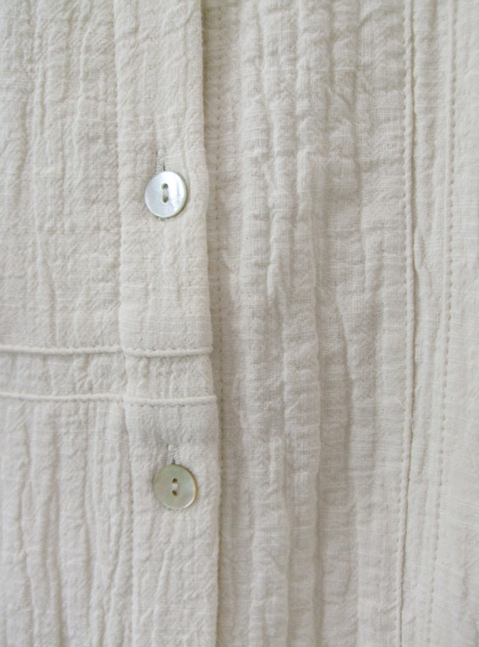 畝のあるナチュラルな表面感のコットン生地とガーゼ生地を接ぎ合せた接結生地のチュニックブラウス。