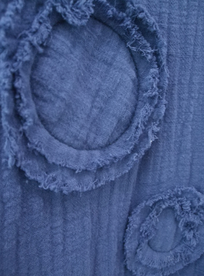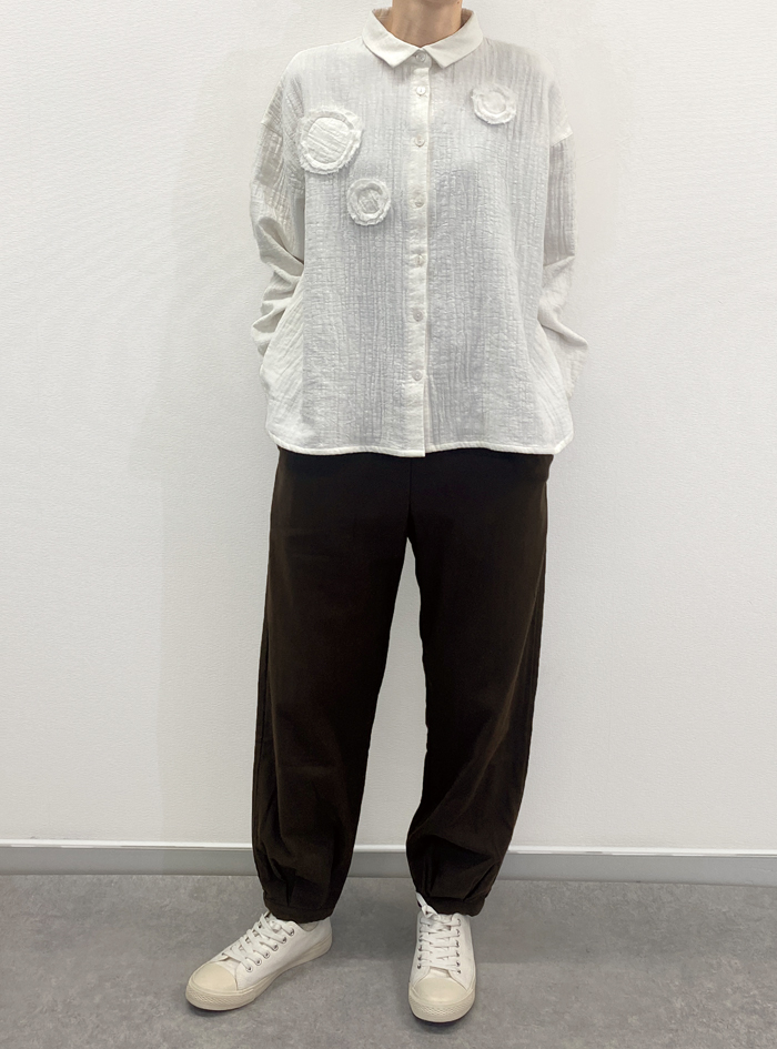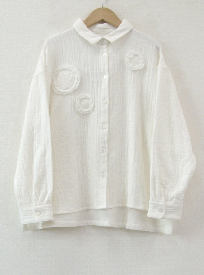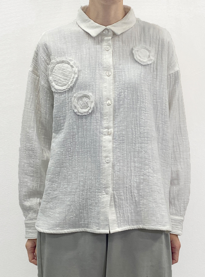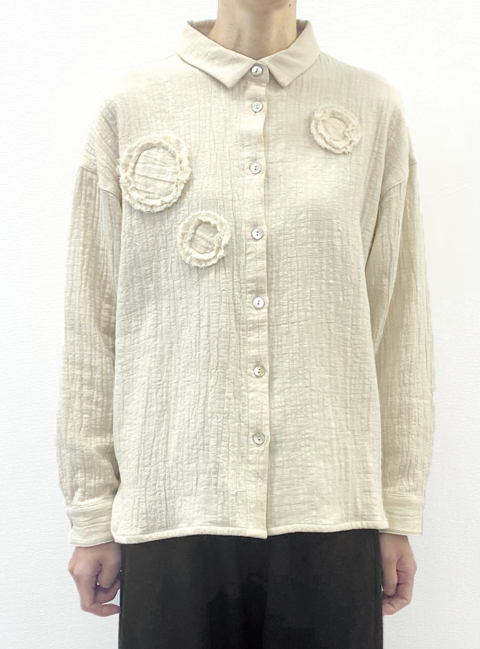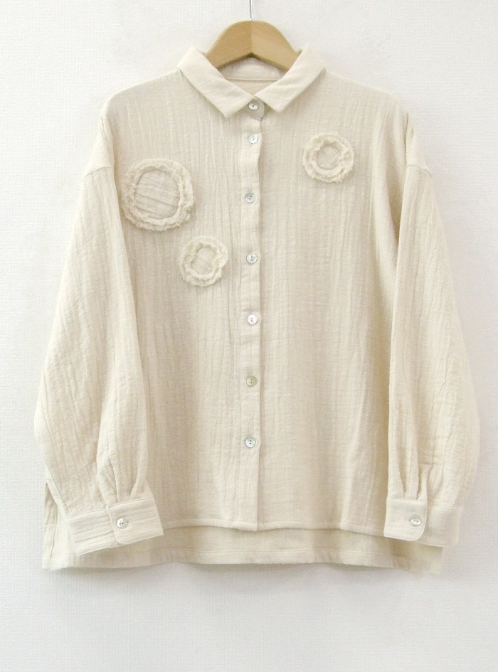 スタンダードなシャツカラーに、切りっぱなしのサークルモチーフがアクセントになった個性的なデザイン。