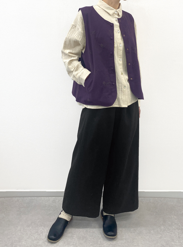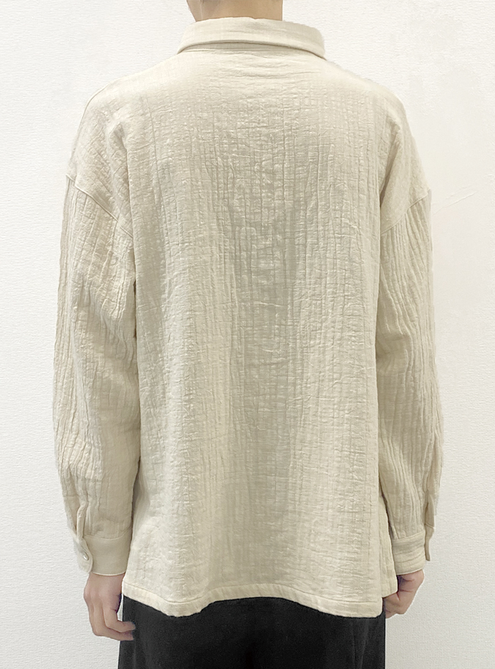 畝のあるナチュラルな表面感のコットン生地とガーゼ生地を接ぎ合せた接結生地のブラウス。