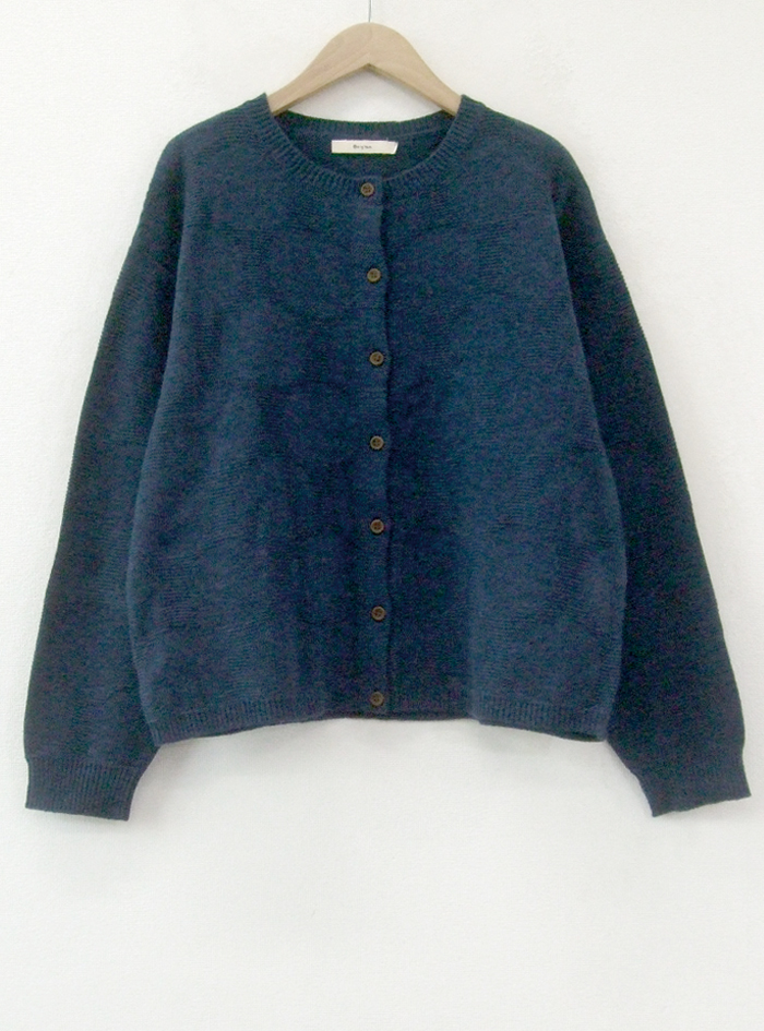 スタンダードなクルーネックカーディガンで、色々なアイテムに合わせやすい冬の着回しアイテムです。