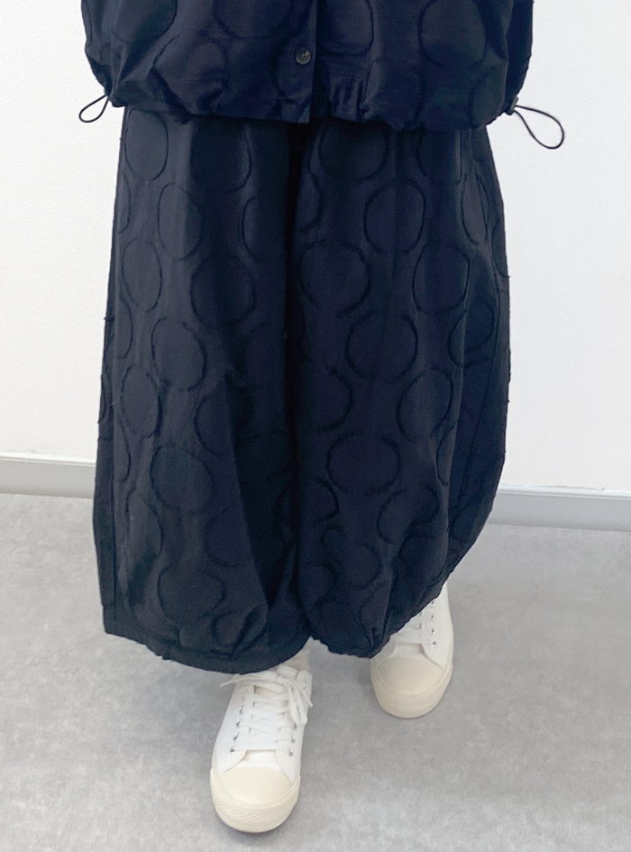たっぷりギャザーでゆったりしたシルエットに、裾のタックカフスデザインでバルーンシルエットに仕上げました。